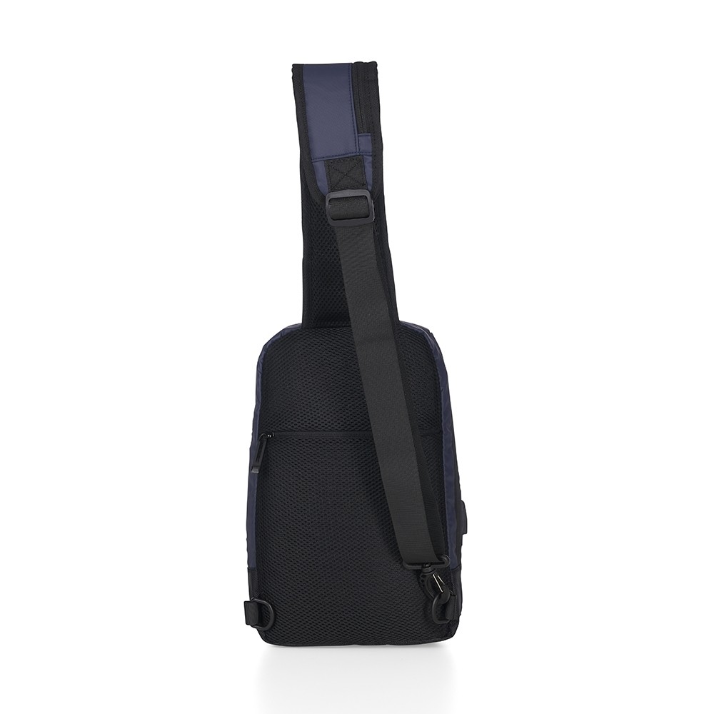 Mochila de ombro 8 litros em couro sintético resistente à água com seis compartimentos, sendo dois deles exclusivos para cartões e proteção contra furto. Contém suporte externo usb, bolso para tablet 9, bolsos internos, faixa refletiva e revestimento costado espumado.