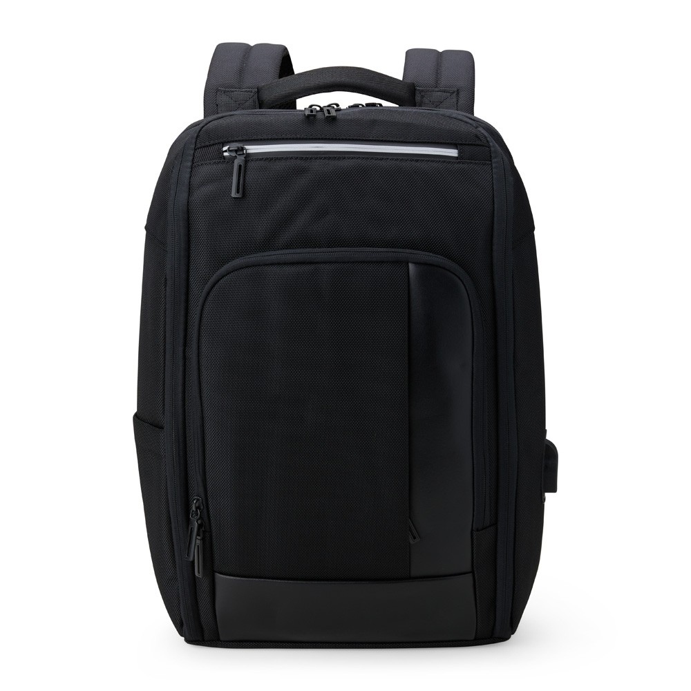 Mochila para notebook em 300D com placa de metal preta personalizável e 2 compartimentos principais. Os 2 bolsos almofadados são compatíveis com computador até 17" e com um tablet de 9,7". Tem ainda mais 2 bolsos nas alças (1 com zipper), bolso oculto nas costas da mochila com zipper, bolso no topo com zipper e bolso aberto na lateral com entrada USB. Contém ainda tira de transporte para trolley e alças e parte posterior almofadadas. 310 x 480 x 130 mm