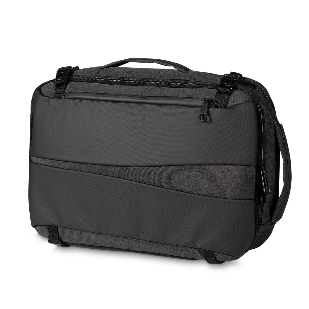 Mochila confeccionada em poliéster com compartimento para notebook até 17 polegadas. Contém Dois compartimentos grandes sendo um com divisórias para documentos, eletrônicos e caneta, e um com divisória para Notebook até 17 polegadas. Compartimento frontal com abertura vertical. Tecido Impermeável. Alça traseira para conter as alças de ombro. Adaptador USB externo com cabo acoplado, permitindo a conexão de um carregador portátil de dentro da mochila e transferência da carga para o lado externo, ocultando o carregador e viabilizando a utilização do celular durante o processo. Contém zíperes com pegadores metálicos, alça de mão em nylon, alças para as costas ajustáveis com revestimento espumado antitranspirante e alça lateral que possibilita que a mochila seja carregada como uma pasta