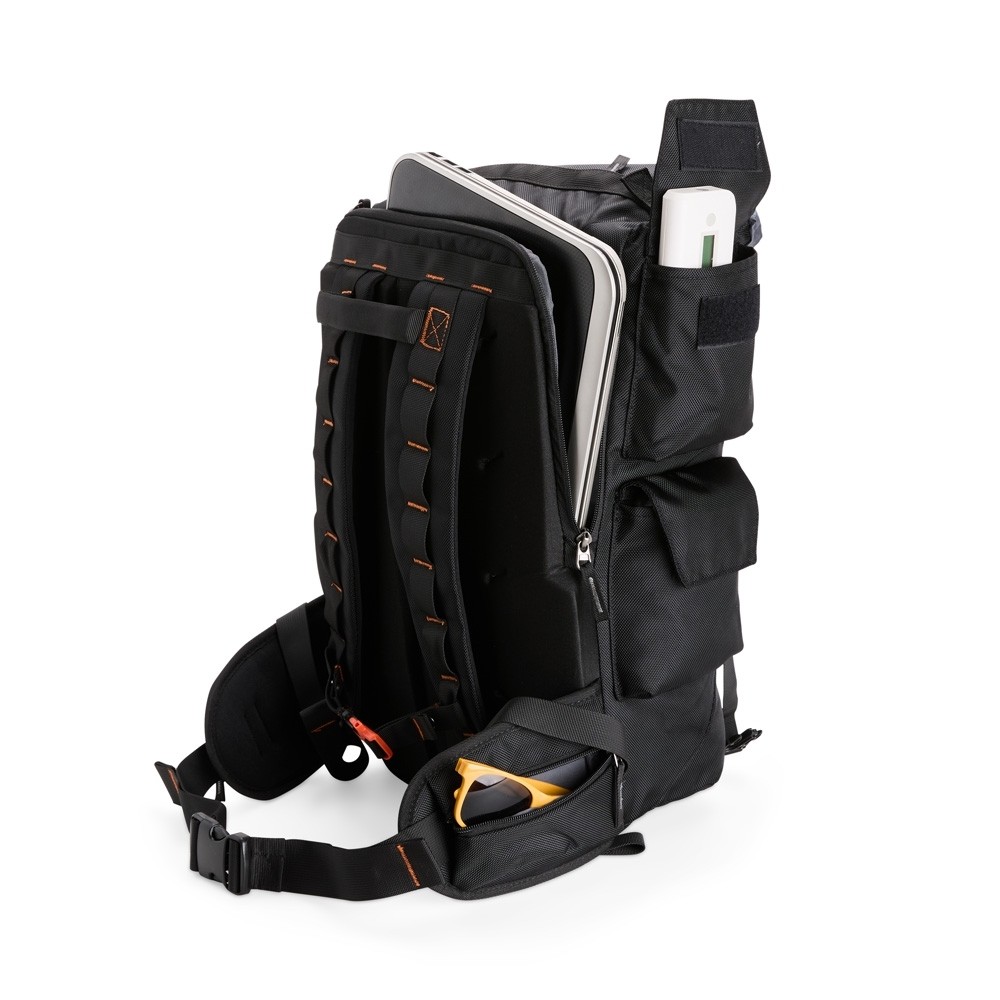 Mochila confeccionada em poliéster impermeável, fechamento por cordão e engate rápido plástico e capacidade máxima de 25 litros. Possui amplo espaço interno com divisória com fechamento em velcro e bolso em tela de nylon próximo à abertura. Apresenta três compartimentos externos: um com fechamento em zíper e dois em velcro nas laterais, além de um bolso lateral em tela de nylon. A parte traseira da mochila conta com outros três compartimentos em diferentes tamanhos, incluindo espaço para notebooks de até 15,6 polegadas.