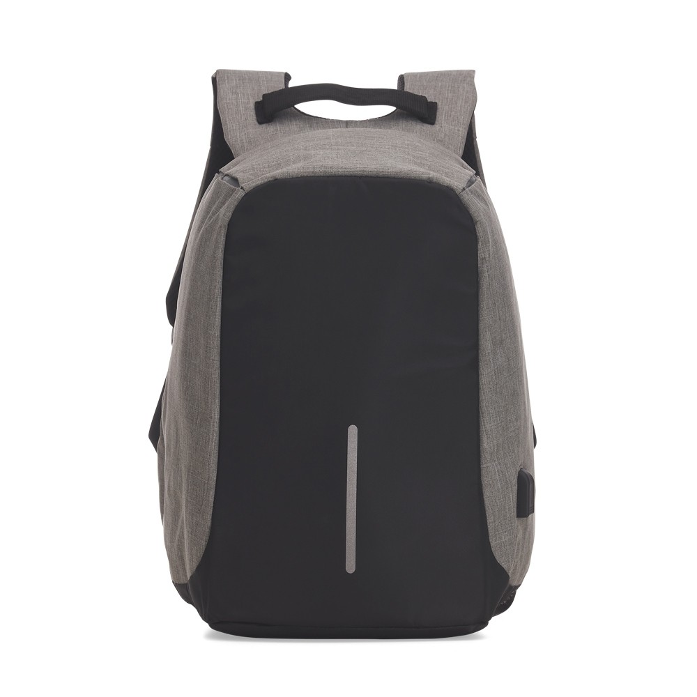 Mochila anti-furto de poliéster. Pensando na segurança do usuário foi confeccionado o compartimento principal na área traseira, impossibilitando a abertura do produto mesmo com a mochila na costa do usuário. Possui dispositivo com entrada USB na parte externa com cabo USB acoplado internamente; permitindo a conexão de um carregador portátil na área interna e a conexão de um eletrônico na área externa, viabilizando a carga e utilização do eletrônico enquanto caminha. Área interna do compartimento principal: bolso para notebook de 15,6 polegadas, bolso para tablet, quatro bolsos para acessórios, possui nas laterais internas sistema de velcro, maximizando a segurança da mochila. Parte frontal com faixa refletiva, alças para as costas ajustáveis revestidas com espuma para um maior conforto sendo uma delas com bolso de zíper, alça para mãos e alça horizontal para encaixe em malas de viagem.
