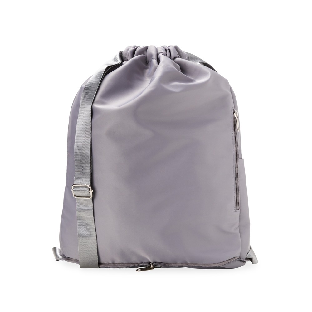 Mochila saco confeccionada em poliéster impermeável com alças em nylon reguláveis. Dispõe de três compartimentos em tamanhos diferentes, incluindo dois bolsos laterais e um bolso interno para itens molhados