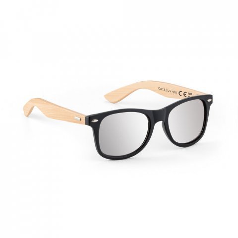 Óculos de sol em PP e bambu Óculos de sol com armação em PP e bambu. Lentes espelhadas de categoria 3 e UV400 de proteção. Em conformidade com as normas EN ISO 12312-1. A cor e o resultado da impressão nos materiais naturais pode variar entre produtos. 146 x 49 x 150 mm