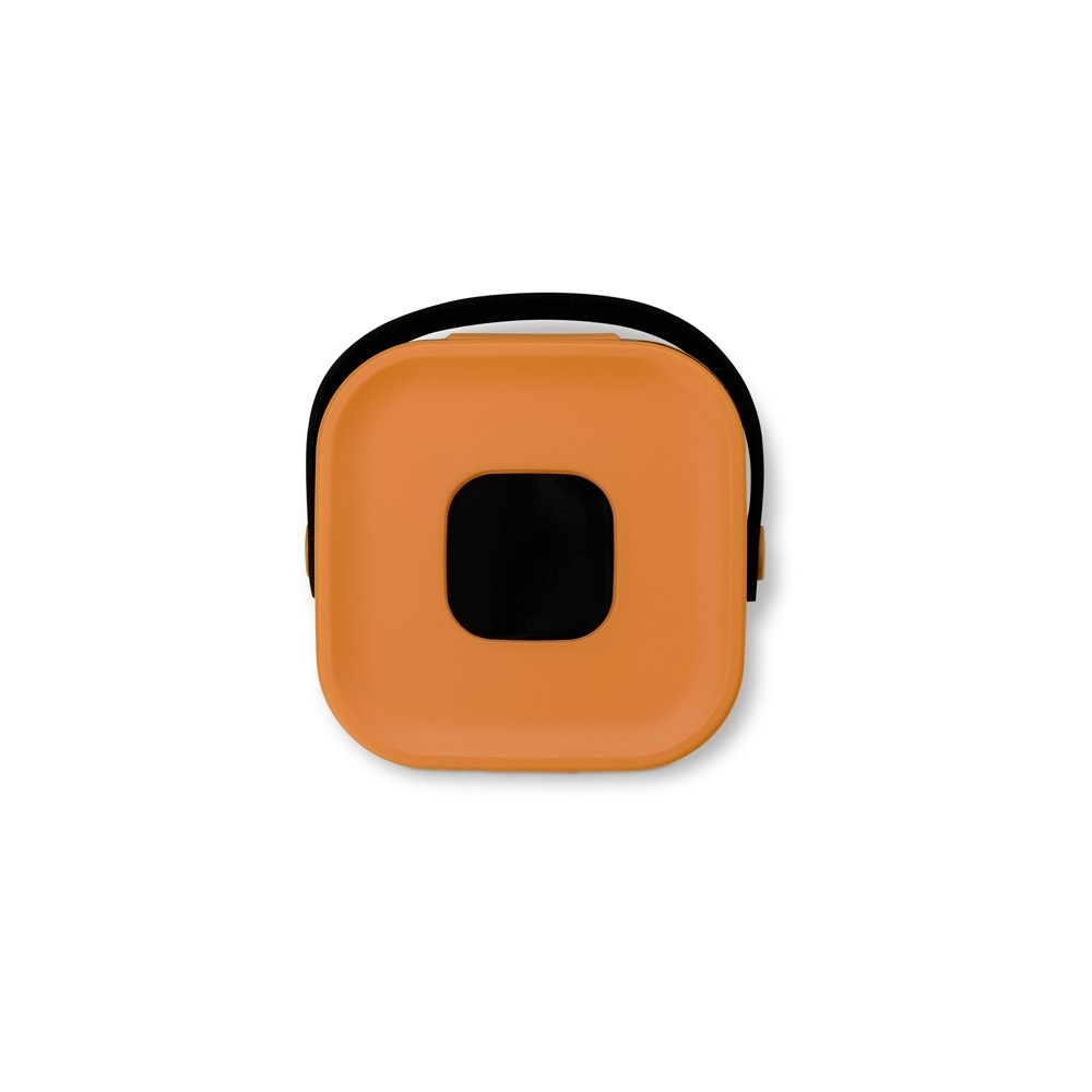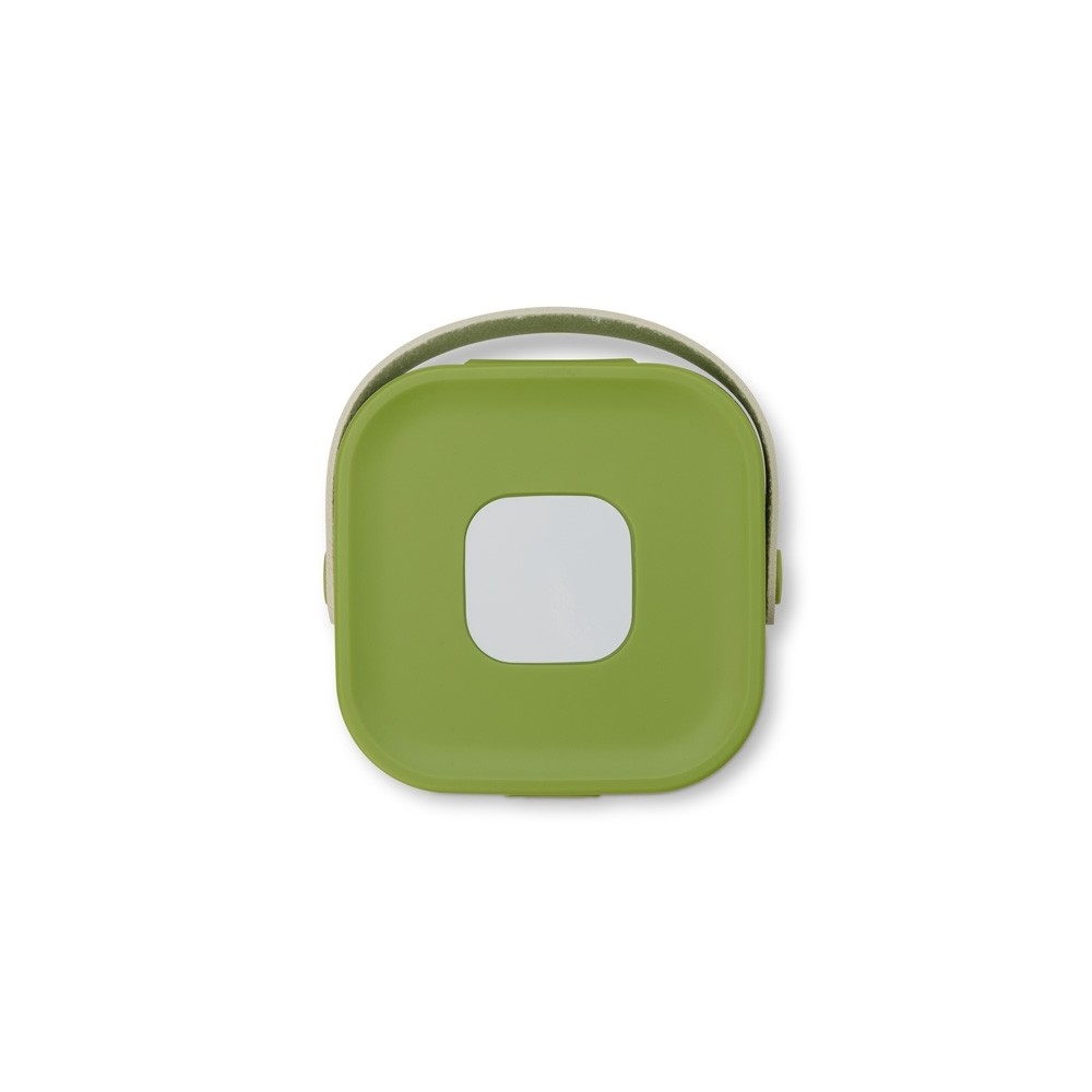 Porta-joias com espelho, produzido em plástico com alça de couro sintético e berço de silicone removível.