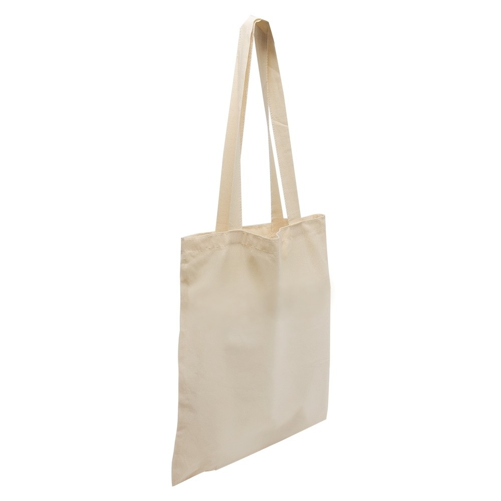 Sacola de algodão 210g/m² com 16 fios e alças costuradas na parte interna.