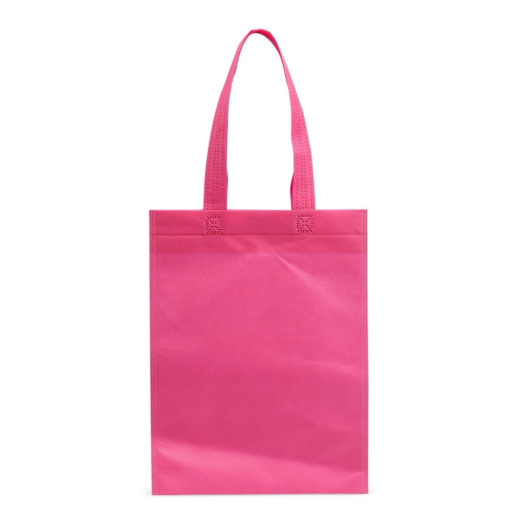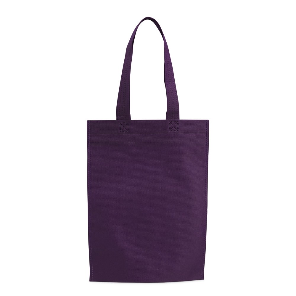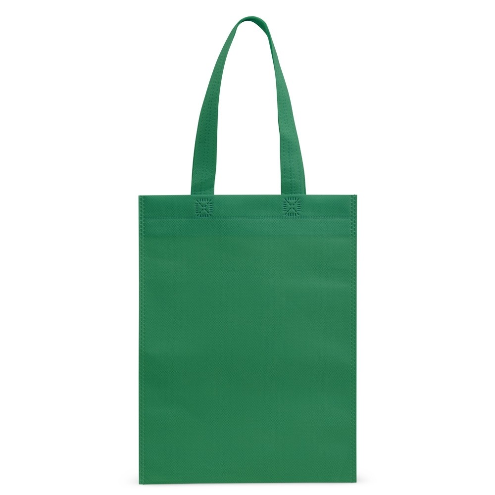 Sacola confeccionada em TNT resistente à água e costura termosselada.