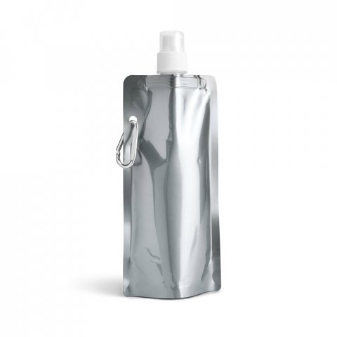 Squeeze dobrável em PE com bico de sistema "push-pull" e acabamento metalizado 460 mL Squeeze dobrável em PE com bico de sistema "push-pull" e acabamento metalizado. Contém uma tampa transparente e um mosquetão para fácil transporte. Capacidade até 460 mL. Certificação EU Food Grade. 110 x 218 x 64 mm