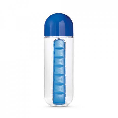 Squeeze em AS com tampa em PE 740 mL Squeeze em AS com tampa em PE, porta comprimidos em PP, com 7 divisórias e capacidade até 740 mL. Caixa branca 94658 vendida opcionalmente. Certificação EU Food Grade. ø75 x240 mm