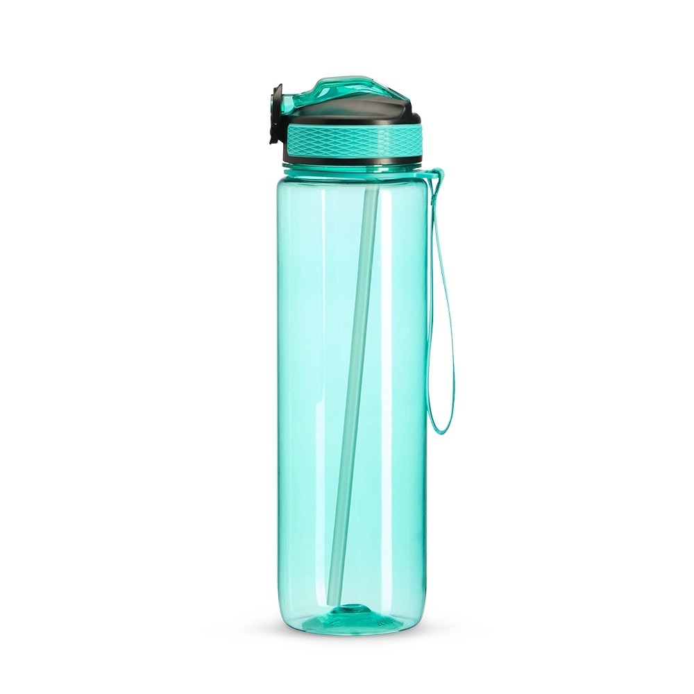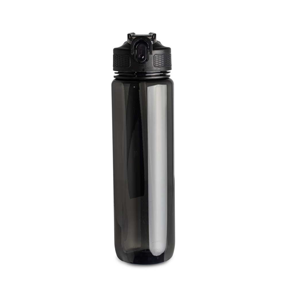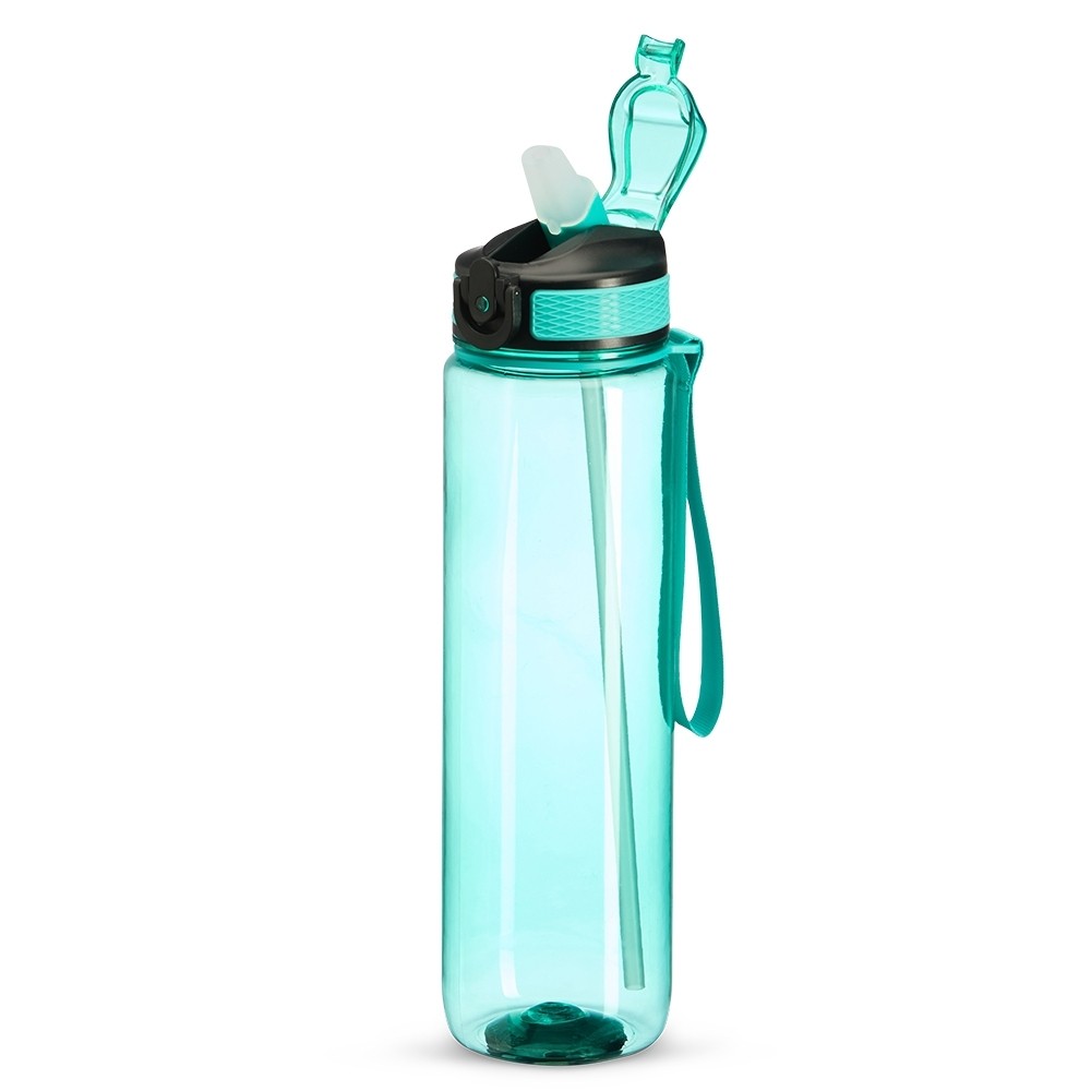 Squeeze plástico com capacidade de 1 litro, livre de BPA. Possui tampa rosqueável com bico de canudo, tampa protetora, botão de acionamento e trava de segurança. Acompanha cordão de nylon e canudo.