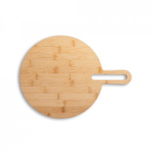 Tábua de servir em bambu com pega, de grande dimensão e de utilização versátil. Ideal para pizza. Fornecido em caixa presente de papel kraft reciclado. Certificação EU Food Grade. A cor e o resultado da impressão nos materiais naturais pode variar entre produtos. 408 x 310 x 12 mm